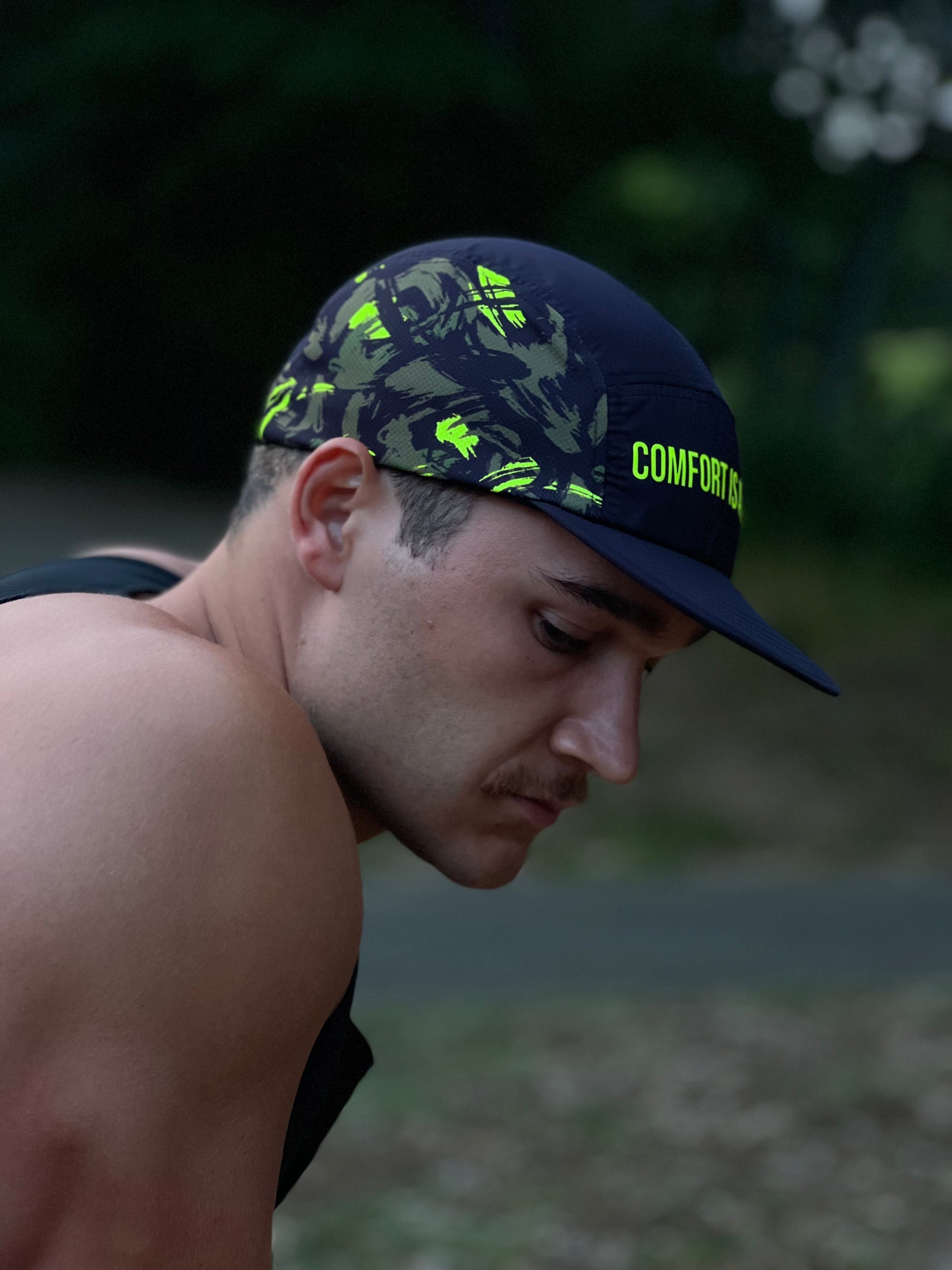 'Comfort Is A Lie' 5 Panel Running Hat - Black/Yellow Brush